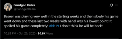 Bandgee Kallra shared her thoughts, saying, “Baseer was playing very well in the starting weeks and then slowly his game went down and these last two weeks with nehal was his lowest point! It spoiled his game completely! #bb19 I don’t think he will be back!”